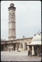View of the courtyard of the Great Mosque of Aleppo showing the ablutions fountain and the minaret