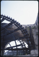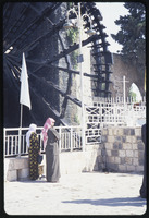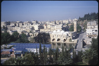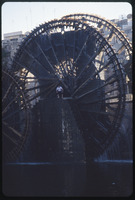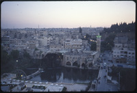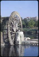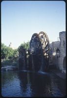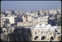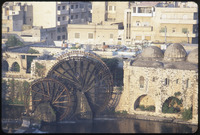 View of Hama with norias in foreground and Nur al-Din Mosque