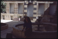 Barbara A. Porter sitting on a fountain of Beit Ajqabash at Al-Jdayde quarter of Aleppo