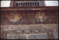 Painted wooden panels showing flowers and fruit with an Arabic mystic poetry verse in Beit Ghazaleh at Al-Jdayde quarter of Aleppo