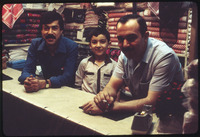 Two men and a child in textile shop in the old market of Aleppo