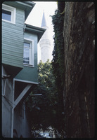 View of minaret between buildings