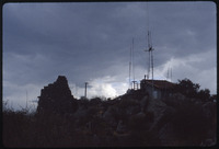 Ruins, modern building, and antennas against sky