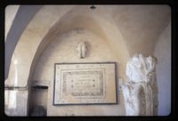 Wall mounted sections of mosaic floor from bath of Herakleides with basalt sarcophagus in front in Umm Qais