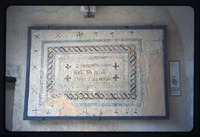 Mosaic with inscription from the entrance to the underground mausoleum displayed in the Archaeological museum (Beit Rousan) in Umm Qais
