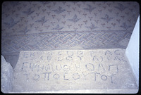 Greek inscription carved on stone displayed in Madaba Archaeological Park at Madaba
