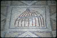 Mosaic floor - depicting bird in a cage from Chapel of the Twal family (Bait Al Twal) in Madaba Archaeological Park at Madaba