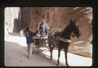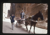 Bedouin man with horse-drawn carriage posing for Valerie Hane in the Siq