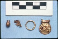 Humeima Excavation Project - Gold bead, pendants, earring - 92.0604.01, 92.0604.02, 92.0604.03, 92.0604.04