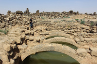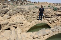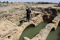 Jordan. Umm al Jimal, Nabataean reservoir, featuring arches used to support a roof that kept drinking water free of contamination and evaporation. Pictured: site steward Muaffaq al-Masaeed