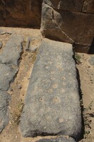 Jordan. Umm al Jimal, doorstep at the main doorway of the Commodus Gate, hinge cup in upper middle, holes thought to have been used for games of Mangala