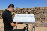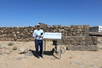 Jordan. Umm al Jimal, Nizar Al Adarbeh of USAID SCHEP in front of interpretive sign for the West Church