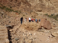 Jordan. Wadi Rum, Ain Shallaleh, SCHEP and USAID teams view rock art from pathway