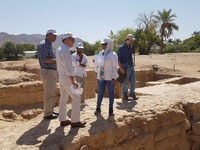 Jordan. Aqaba (Ayla), Glenn Corbett of ACOR (far left), Jehad Haron (left), site steward Mustafa Ajlouni (far right), Islam Sleim, USAID team members