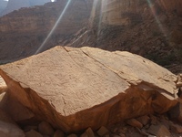 Jordan. Wadi Rum, path to Ain Shallaleh, rock art on flat surface of central rock