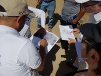 Jordan. Aqaba (Ayla), The Royal Marine Conservation Society of Jordan (JREDS) team members checking updates at site, with site steward Mustafa Ajlouni and Glenn Corbett of ACOR in the background
