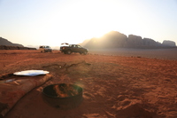 Jordan. Wadi Rum, firepit and trucks near Bedouin campsite