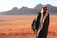 Jordan. Wadi Rum, Bedouin man walking towards mountain