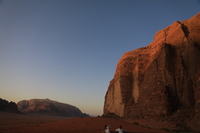 Jordan. Wadi Rum, group of Bedouin men at campsite in foreground, mountains in the distance