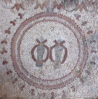 Jordan. Madaba, Madaba Archaeological Park West, welcoming sandals medalion embedded at the entrance to the east wing of the 6th-century Byzantine Burnt Palace, looking east