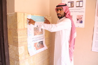 Jordan. Wadi Rum, Salem Al Zalabieh hangs poster at visitor center