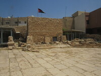 Jordan. Madaba, Madaba Archaeological Park West, early 20th-century clinic building in center with two wings (covered, west and east) of the 6th-century Byzantine Burnt Palace, foregrounded by the 2nd-century paved Roman plaza and cardo