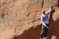 Jordan. Wadi Rum, Mohammed Al Domyan of the Wadi Rum Protected Area explaining rock art and Thamudic and Arabic inscriptions