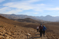 Jordan. Wadi Araba, Bir Madhkur, group of visitors walking on ad-Dlayi path, part of the ancient incense route which leads from Khirbat Bir Madhkur to Petra, with an interpretive sign installed with support from USAID SCHEP