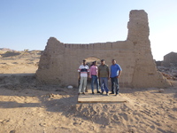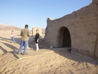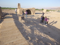 Jordan. Ghawr as Safi, visitors in front of entrance to sugar factory (Masna’ as-Sukkar) archaeological site