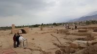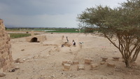 Jordan. Ghawr as Safi, lower area in front (north) of the sugar presses. Sugar juice conduit on the right of photo, leading to the sugar processing (boiling and curing) area in the background at sugar factory (Masna’ as-Sukkar), SCHEP team in distance