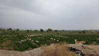 Jordan. Ghawr as Safi, agricultural fields near Khirbet Sheik Isa, local residents, goats, dog