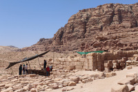 Jordan. Petra, Temple of the Winged Lions, east wall of TWL, Umm al Biyara in background, team members under shade