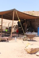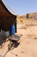 Jordan. Petra, Temple of the Winged Lions, wheelbarrow, liquid container inside tent