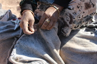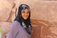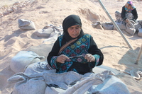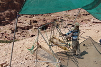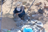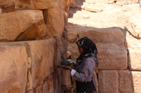 Jordan. Petra, Temple of the Winged Lions, team member sewing sandbags