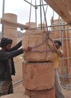 Jordan. Petra, Temple of the Winged Lions, Hamza Wakhyan and Franco Sciorilli repositioning conserved column 34 E drum. Note pre-applied mortar layer between drums