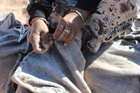 Jordan. Petra, Temple of the Winged Lions, team member sewing sandbags