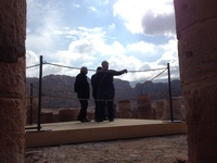 Jordan. Petra, Temple of the Winged Lions, Director General of the Dept. of Antiquities Dr. Monther Jamhawi with Elena Ronza and Mohammad Shobaki, looking into the entrance to the temple