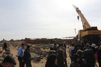 Jordan. Umm al Jimal, crane for restoration activities, Barbara Porter and other visitors