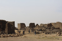 Jordan. Umm al Jimal, Commodus Gate, visitors, scaffolding in background