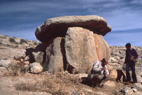 Jordan. Khirbat Al Makhayyat, looking Northeast, close up view of Dolmen to Southwest of site (South of Wadi el-Mekhayyat), two men
