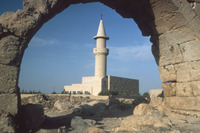 Jordan. Karak, Mashhad, looking Northeast, close up view of modern Mosque, from arch in ruins