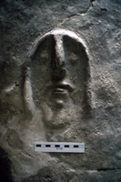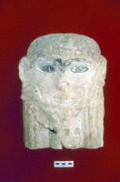 Jordan. Dhiban, Close up of Iron II (Moabite) face on clay coffin from tomb