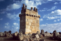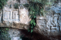 Jordan. Manja, Late Ottoman Tomb at Manja village, North of Jalul - looking Northeast (note carved coffeepot and cups on West face of tomb; coffee roasting utensils on South face).