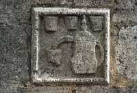 Jordan. Manja, Close up of carved coffeepot and cups on Late Ottoman Tomb at Manja village, North of Jalul - looking East