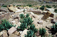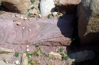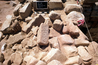 Detail of sandstone ashlar block in wall of central apse. View to east. Pre-application of Wacker O.H. consolidant. Roll 1 - 36.