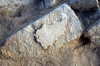 View to west. Before velatura lifting of block. Roll 2 - 23. - Sq. B1. Locus 7. Column drum plaster fragment in soil.