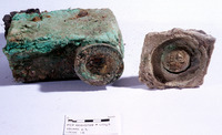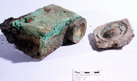 Cu/Cu alloy door hinge + lead/ Cu alloy mount. Pre-conservation. - Sq. K3. Studio. Locus 18/Pail 36. Reg # PCP 0042.