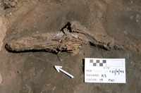 Close-up view to east of iron piece in-situ after removal of nail. - Sq. K3. Locus 19/FN1.