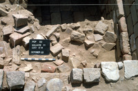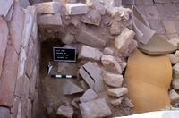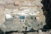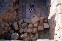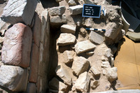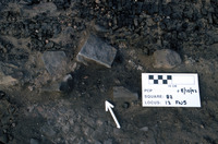 Close-up view to east of Cu/Cu alloy door hinge in-situ. (refer to CS 38/6-7) - Sq. B2. Locus 12/FN6 & 7.