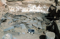 Close-up view to east of Cu/Cu alloy pieces in-situ. ( taken withour card in frame) CS only - Sq. B2. Locus 12/FN8.